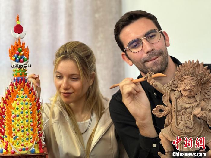 圖為高佑思和露露體驗熱貢藝術(shù)。李江寧 攝