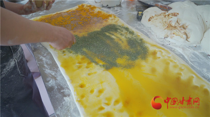記者走進榆中縣金崖鎮(zhèn)浩燕饅頭店,一股濃濃的胡麻油、玫瑰醬、香豆等混合的香氣撲面而來,李浩燕正在忙碌地趕制一批榆中傳統(tǒng)手工月餅。案板上除了發(fā)好的面團,還擺上了炒胡麻碎、姜黃、白砂糖等豐富的佐料。只見李浩燕從揉面開始,然后鋪餡、搟制、卷面、切分、披花,一道道工序一氣呵成。經(jīng)過一個多小時,新鮮美味的月餅出爐了,切開后,內(nèi)里豐富,色彩斑斕,咬上一口軟糯可口,回味留香。