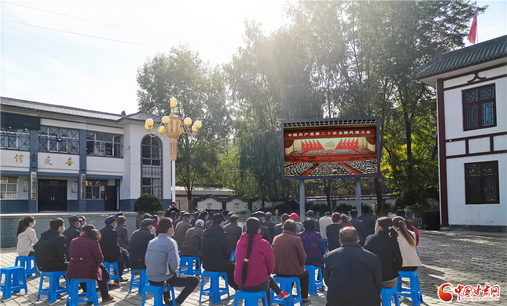 平?jīng)鍪袥艽h汭豐鎮(zhèn)鄭家溝村干部群眾早早來到村公共服務中心廣場,通過大屏幕收看大會開幕盛況。