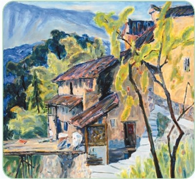 李躍亮油畫(huà)作品《嶺頭民居》。