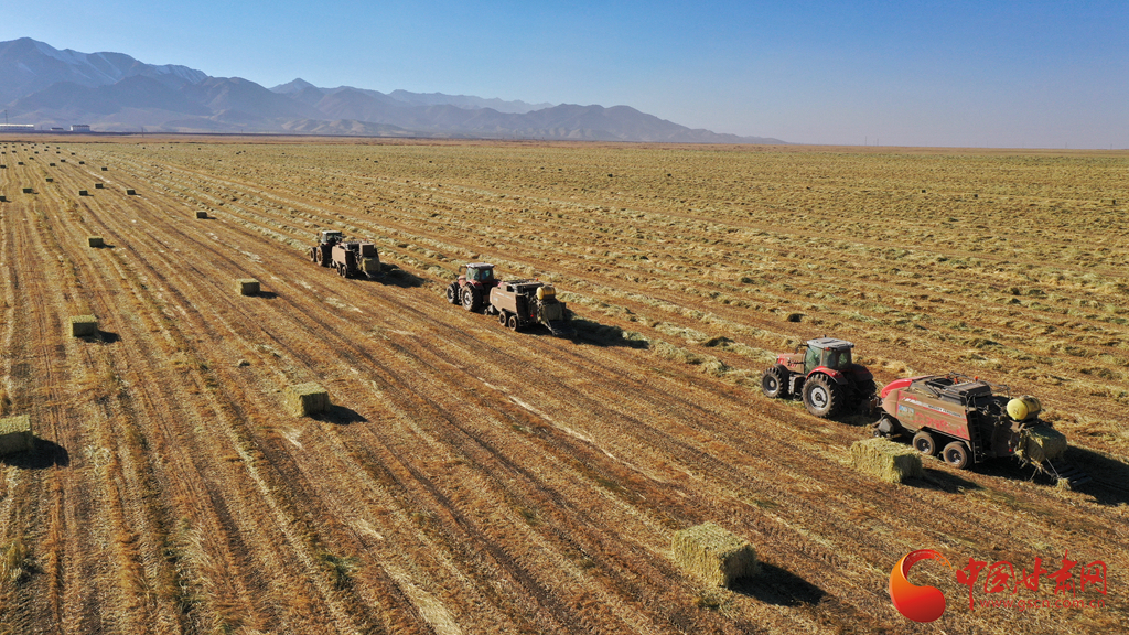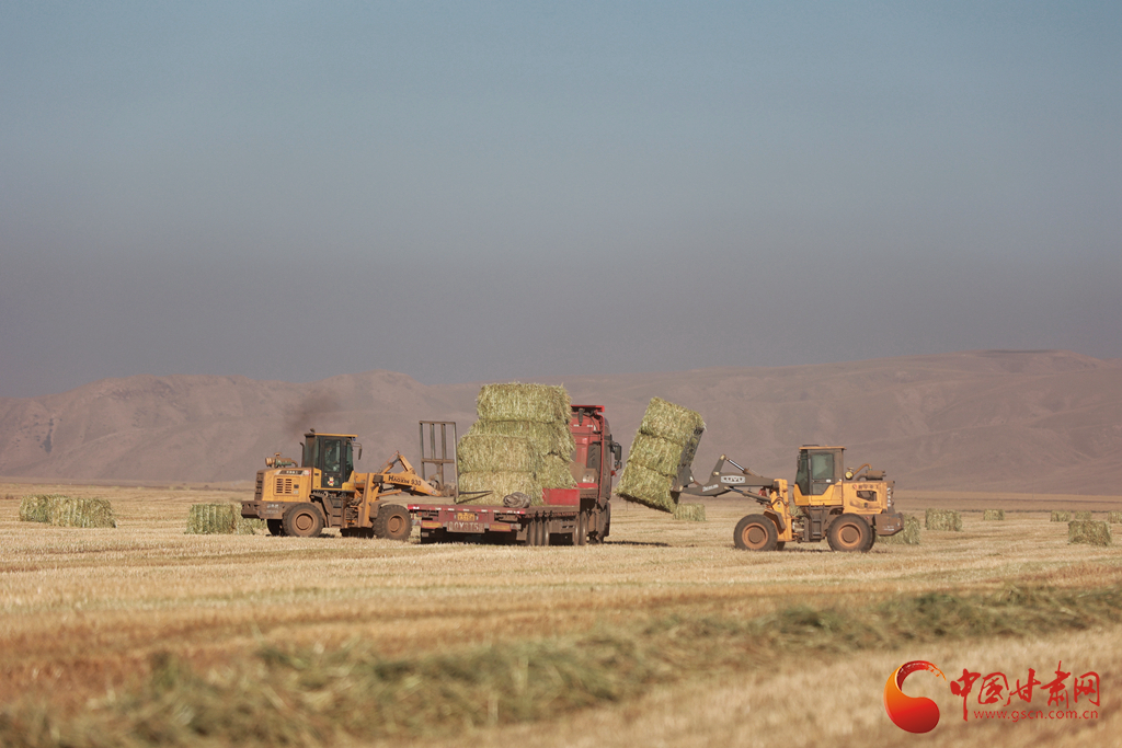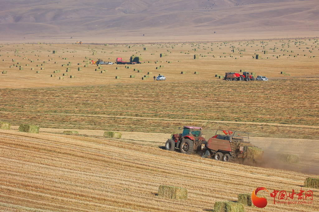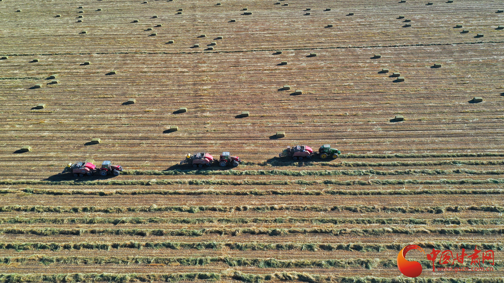 11月9日,甘肅山丹馬場正在對此前收割晾曬的21萬畝燕麥草打包運輸,一輛輛大型農(nóng)用機械穿梭田間忙碌作業(yè)。
