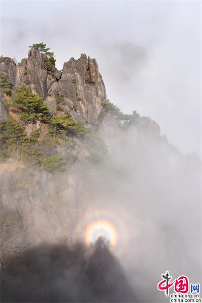 原標(biāo)題:安徽黃山:云海和佛光演變?nèi)鐗羧缁靡饩?/p>