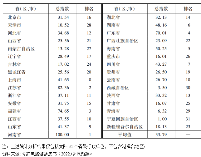 近日,北京第二外國語學(xué)院旅游科學(xué)學(xué)院與社會科學(xué)文獻出版社共同發(fā)布了紅色旅游藍皮書《中國紅色旅游發(fā)展報告(2022)》(以下簡稱《藍皮書》)。《藍皮書》指出,中國紅色旅游發(fā)展水平持續(xù)提升,31個省級行政單位(不含港澳臺地區(qū))的紅色旅游發(fā)展指數(shù)排名中,位列前十的依次為河南省、江蘇省、福建省、廣東省、海南省、湖南省、四川省、上海市、山東省、江西省。