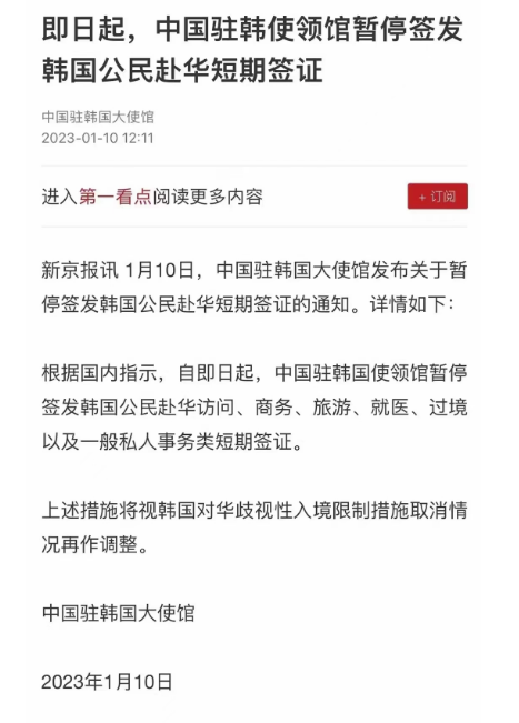 今天,中國駐韓國大使館發(fā)布《關(guān)于暫停簽發(fā)韓國公民赴華短期簽證的通知》(以下簡(jiǎn)稱《通知》)。通知稱,根據(jù)國內(nèi)指示,自即日起,中國駐韓國使領(lǐng)館暫停簽發(fā)韓國公民赴華訪問、商務(wù)、旅游、就醫(yī)、過境以及一般私人事務(wù)類短期簽證。