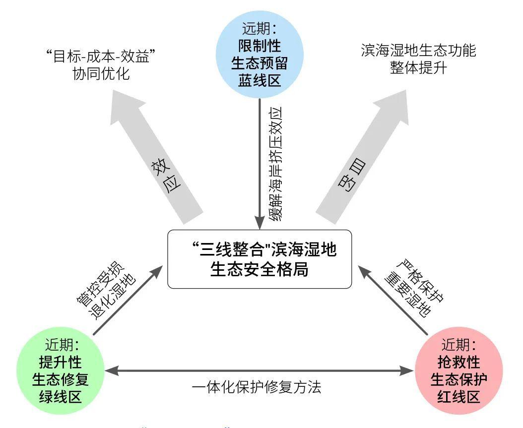 據(jù)此,文章提出了應(yīng)對(duì)圍墾開發(fā)和適應(yīng)海平面上升情形下“三線整合”中國濱海濕地生態(tài)安全格局相關(guān)概念,包括:搶救性保護(hù)生態(tài)紅線區(qū),優(yōu)先開展?jié)竦匦迯?fù)的生態(tài)修復(fù)綠線區(qū),以及適應(yīng)氣候變化影響下海平面上升的生態(tài)預(yù)留藍(lán)線區(qū)。文章在剖析相關(guān)概念的基礎(chǔ)上,聚焦我國大江大河三角洲,針對(duì)濱海濕地保護(hù)修復(fù)、海岸帶管理和國土空間開發(fā)提出了相關(guān)措施和建議。