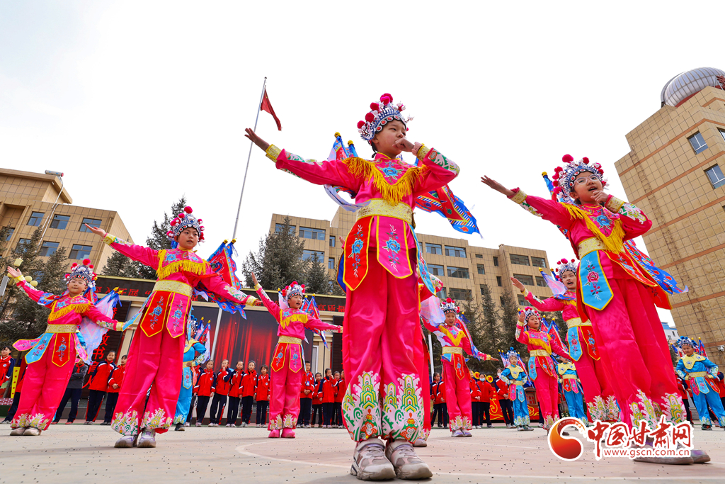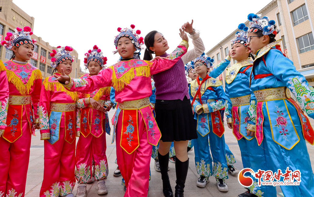 3月22日,在甘肅省張掖市民樂縣洪水小學(xué),戲曲演員正在給同學(xué)們指導(dǎo)戲曲動(dòng)作、傳授唱腔。
