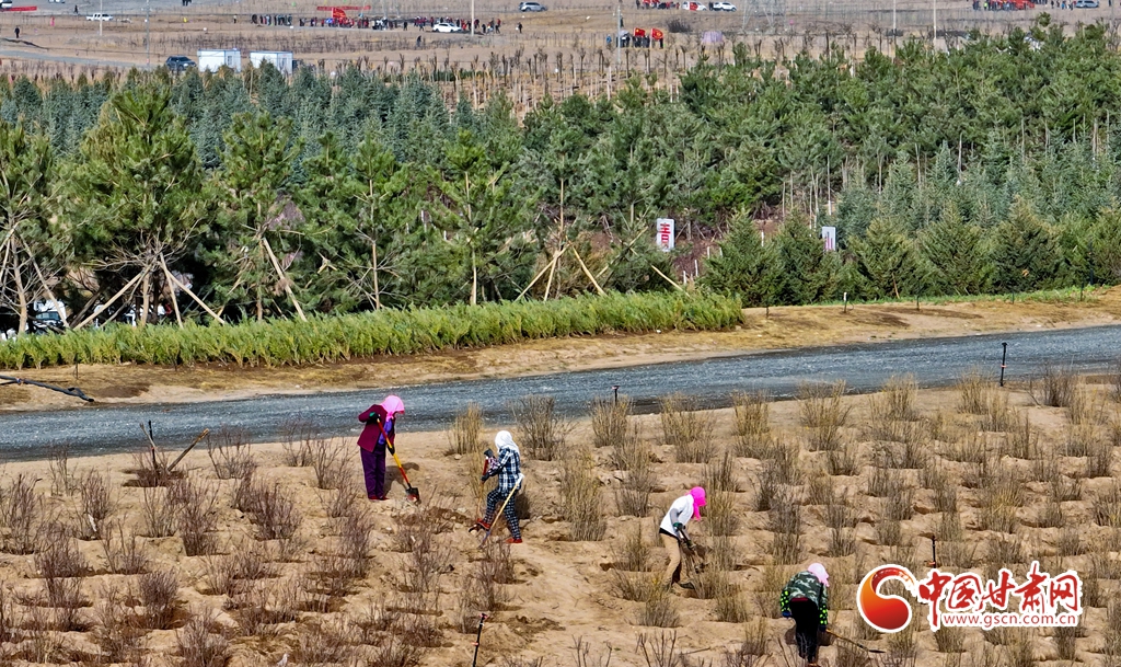 4月11日,在甘肅省張掖市甘州區(qū)黑河西岸黑河灘彩虹林海生態(tài)造林示范區(qū)內(nèi),眾多干部職工正在植樹。