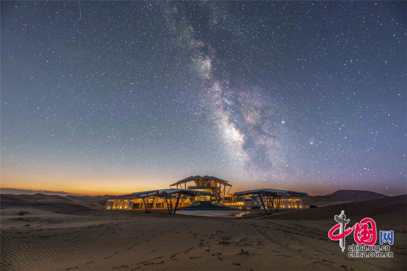 沙坡頭旅游區(qū)依托良好的生態(tài)資源,打造了國內(nèi)首個以沙漠觀星為主題打造的酒店——星星酒店,在蒼茫遼闊的沙漠之中,這座造型獨特的酒店仿佛星星一般,閃爍其中。