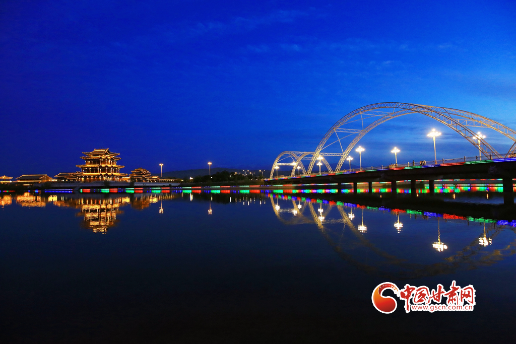 7月5日,甘肅省嘉峪關(guān)市南湖討賴河畔晚霞如輝,夜景璀璨,構(gòu)成一幅美麗的夏日畫卷。