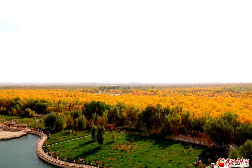 秋高氣爽,金塔沙漠胡楊林景區(qū)進(jìn)入最佳觀賞期,大片胡楊由翠綠轉(zhuǎn)成金黃,與湛藍(lán)的天空交相輝映。在蒼茫大漠之上,萬畝胡楊層林盡染,形態(tài)各異的胡楊巍然屹立,依水而生。