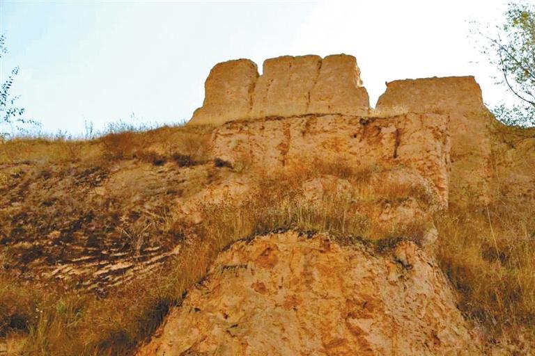 在威戎鎮(zhèn)見到的第一處遺存,是位于威戎鎮(zhèn)廣場后的一處臺地。這一處遺存,是一段殘破的老城墻,以及一座形似堡樓的殘?jiān)U驹谂_地之下,仰望斷墻,人工修筑的痕跡十分明顯,層層黃土夯筑,因?yàn)閺U棄殘破而長滿了荒草。走近堡樓,可以看見當(dāng)時(shí)修筑時(shí)搭建木椽的孔洞,還有很多手掌大小的圓形石塊。
