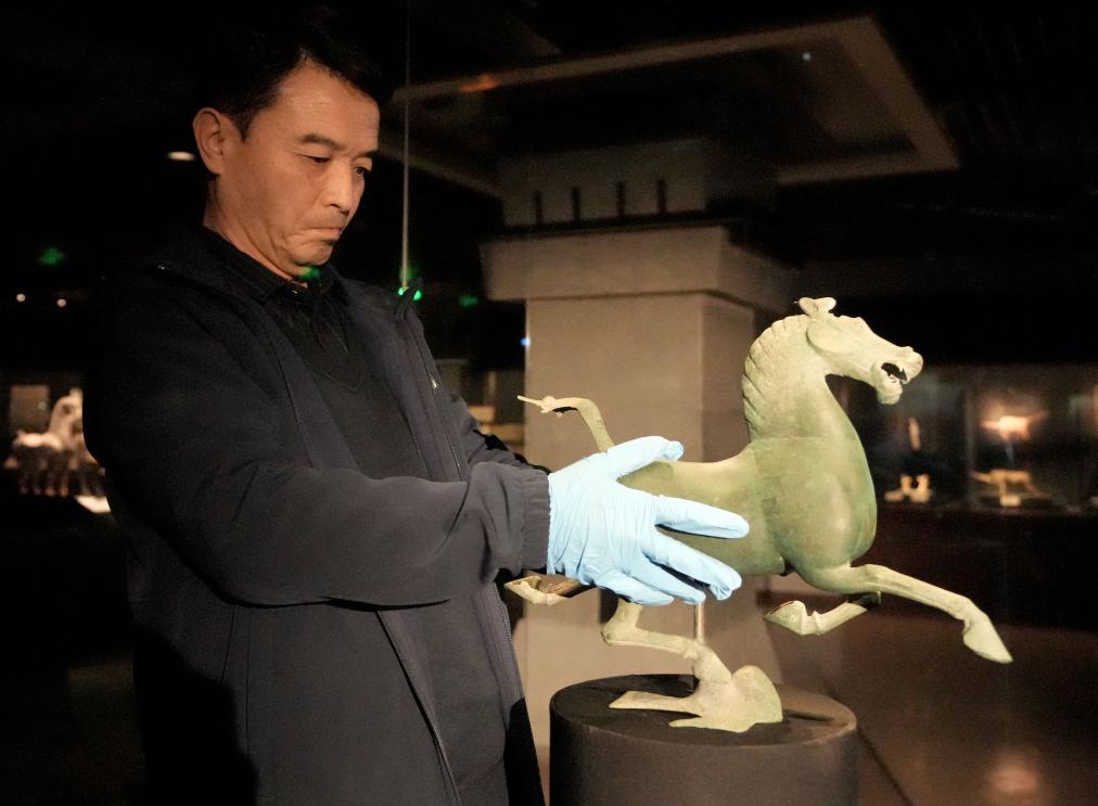 工作人員在甘肅省博物館展廳內(nèi)安放銅奔馬(2023年10月27日攝)。新華社記者 王毓國(guó) 攝
