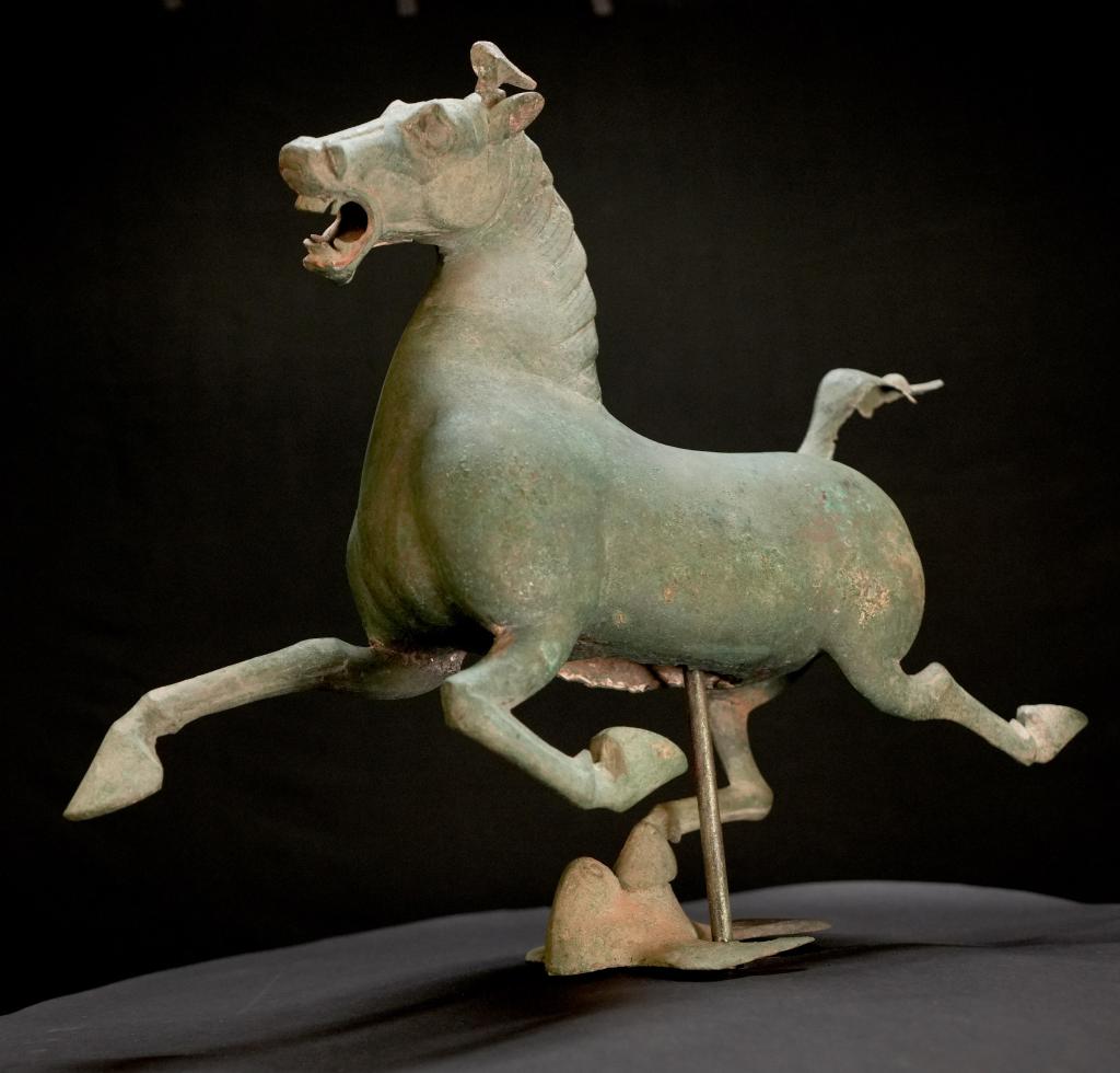 甘肅省博物館歷史部主任王勇介紹,銅奔馬名聲遠(yuǎn)揚(yáng),關(guān)于它的諸多研究緊隨其后:命名的爭(zhēng)議、造型的解讀、墓主人身份的推測(cè)、鑄造工藝的探討……迄今為止,研究不斷,許多爭(zhēng)議仍無(wú)定論。