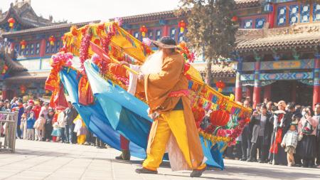 安定現(xiàn)龍山秧歌會在玉湖公園舞龍。  牛小棟 攝