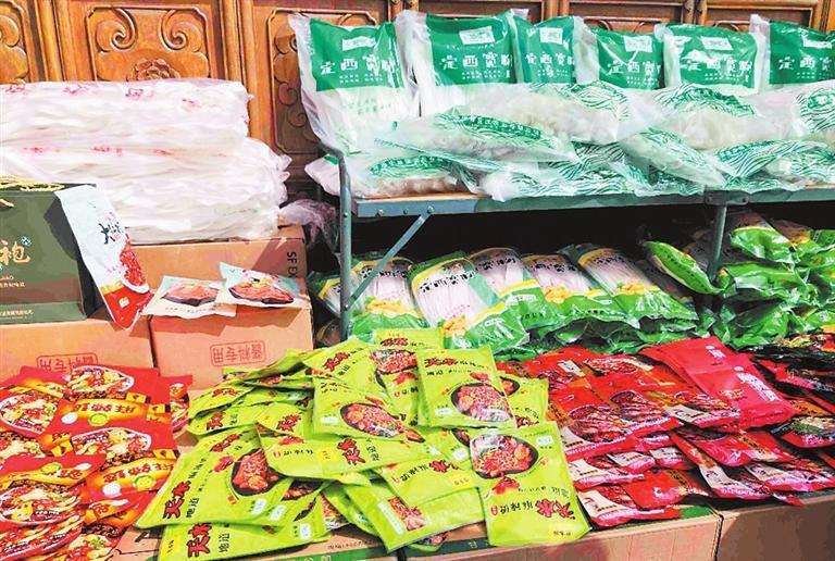 在城門入口的一個(gè)代銷店,各種包裝的麻辣燙底料、定西寬粉吸引了許多游客前來購(gòu)買。