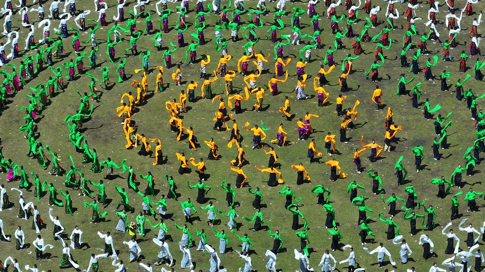 在歡快優(yōu)美的樂曲聲中,萬人鍋莊開始展演,動聽的樂曲、颯爽的舞姿、五彩的服裝,將甘南的生態(tài)之美、文化之美、民俗之美、和諧之美展示得淋漓盡致。圓圈形的鍋莊舞表達了甘南人民在中國共產(chǎn)黨領(lǐng)導(dǎo)下,各民族像石榴籽一樣緊緊擁抱在一起,為推動甘南高質(zhì)量發(fā)展,畫出最大同心圓。