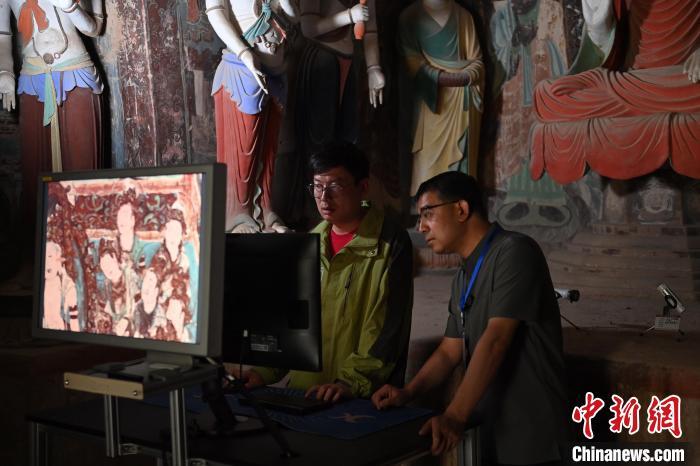6月5日,敦煌莫高窟內(nèi),敦煌研究院文物數(shù)字化研究所工作人員進(jìn)行敦煌壁畫(huà)數(shù)字化圖像現(xiàn)場(chǎng)檢查工作。中新社記者 李亞龍 攝