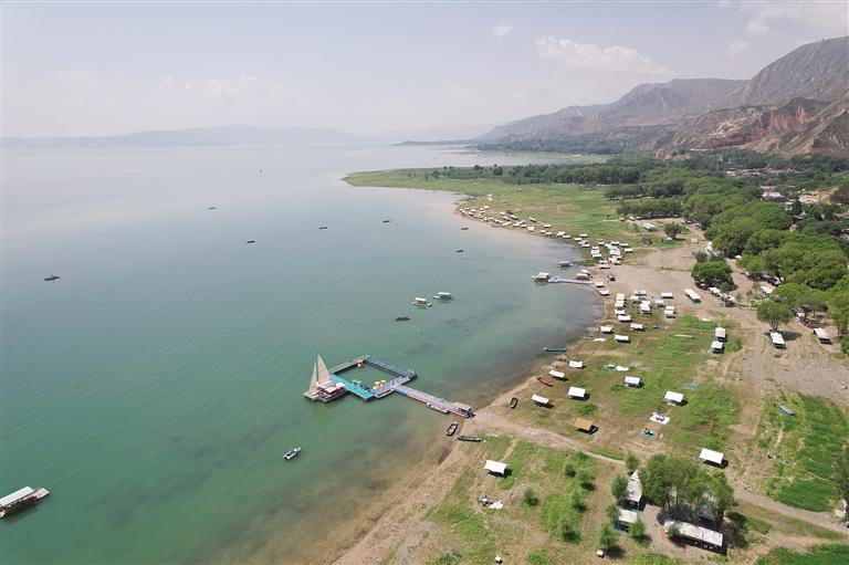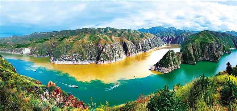 提及永靖劉家峽,第一反應就是一個成語——“涇渭分明”。受上游降水影響,洮河河水比較渾濁,在與黃河交匯處劉家峽水庫的清波“相遇”時,形成一清一黃兩股水流,河流呈“Y”字形交匯。交融卻不滲透,加上河中的石山,猶如兩條巨龍游戲于此,在當?shù)剡@一景象也被稱為“二龍戲珠”。初秋時節(jié),來自全國各地的游客站在黃洮交匯觀景臺上,感受這份來自大自然的震撼與壯美,從高處遠眺入河口,“黃河清,洮河黃”,可謂“涇渭分明”,景色極為壯觀。
