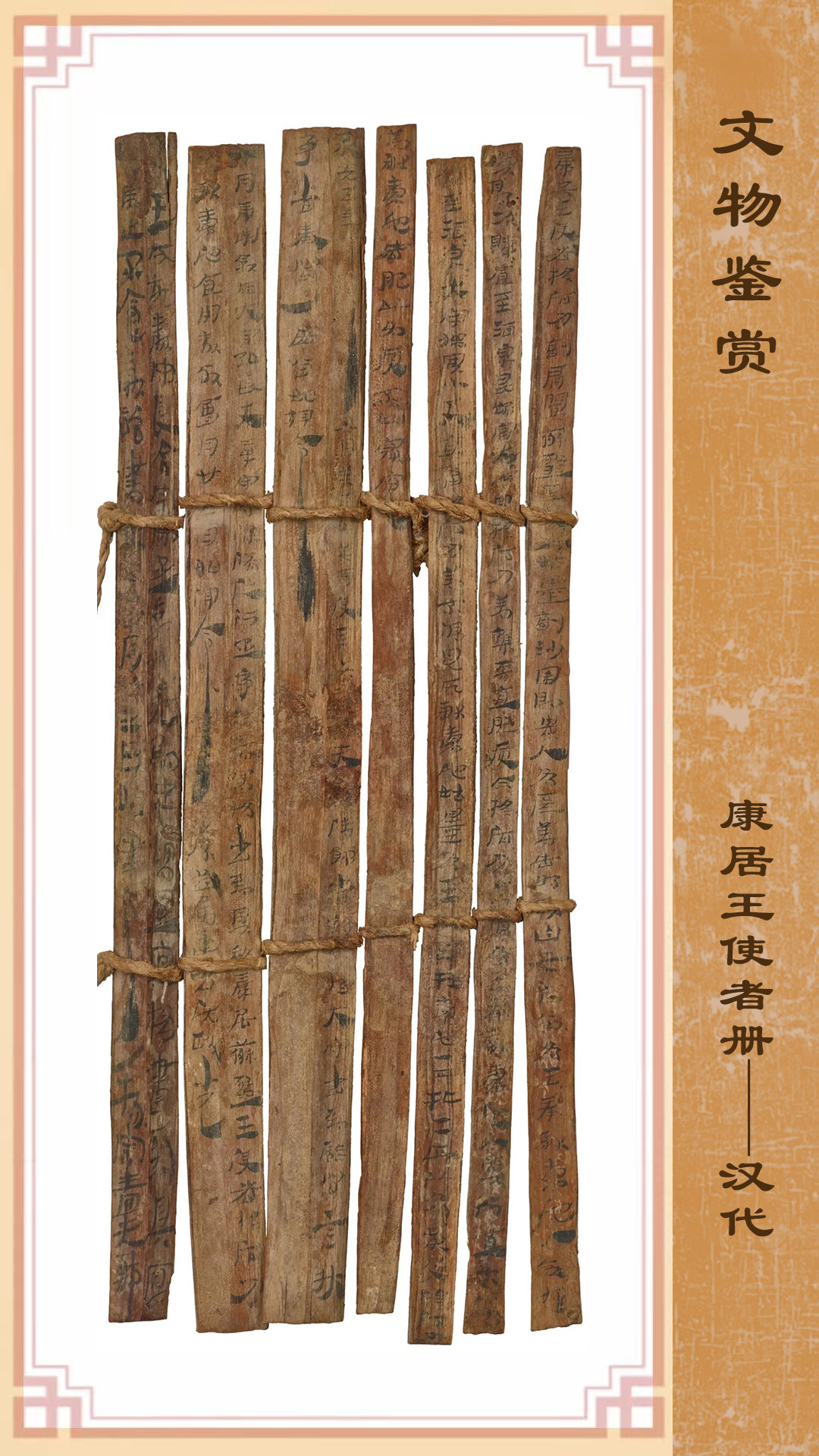 這份珍貴冊書記錄內(nèi)容為:永光五年(公元前39年),康居王使者和蘇薤王使者及貴人所獻(xiàn)的貢物在酒泉評估時發(fā)生了糾紛,朝廷責(zé)令敦煌郡和效谷縣進(jìn)行調(diào)查并將當(dāng)時的情況如實上報。該冊書的出土,不僅為研究當(dāng)時的行政和司法審判程序提供了第一手資料,更重要的是為研究漢朝與康居國的關(guān)系提供了原始資料,亦是今天的中亞各國研究本國古代歷史的重要資料,可補(bǔ)傳世史籍之闕載。現(xiàn)藏甘肅簡牘博物館。