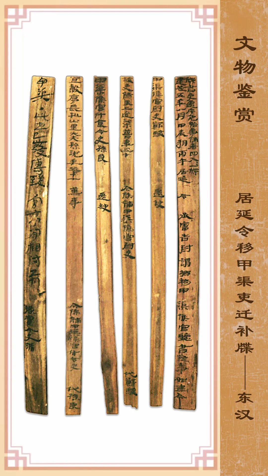 第一簡文字為:“牒書:吏遷、斥免、給事補者四人,人一牒。建武五年八月甲辰朔丙午,居延令 丞審告尉:謂鄉(xiāng)移甲渠候官,聽書從事,如律令。”這是文件的標(biāo)題和行文要求。“居延令”之后尚留空白,說明這是一份還未正式生效的官員任免文件。其他4簡則是此次任免人員和崗位的具體內(nèi)容。在簡牘背面書有此文件的起草人掾黨和令史循二人,屬于共同署名。該文書對了解漢代基層吏員的任免、除補等基本程式有重要參考價值。現(xiàn)藏甘肅簡牘博物館。