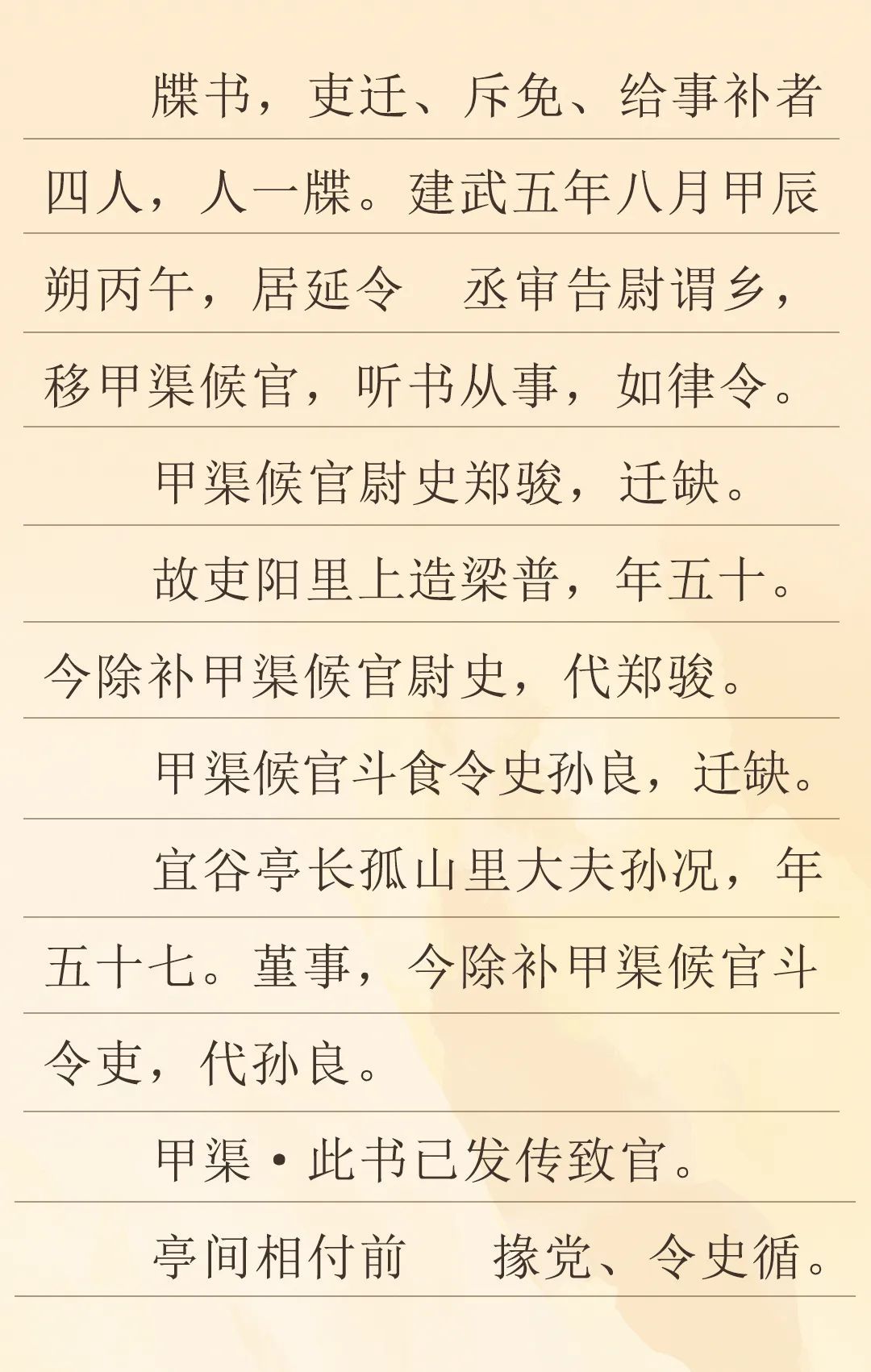 這是一份距今1995年的地方官員任命書。當(dāng)時是東漢建武五年八月,在漢代張掖郡居延邊塞的甲渠候官進行了人事調(diào)整,對官吏進行了任免。一個是甲渠候官尉史鄭駿升遷,由五十歲的梁普補缺;另一個是甲渠候官斗食令史孫良升遷,由五十七歲的原宜谷亭長孫況代任,其中提到孫況做人低調(diào)、行事嚴(yán)謹(jǐn)(即“謹(jǐn)事”)。這次人事調(diào)整是由居延縣負(fù)責(zé)。
