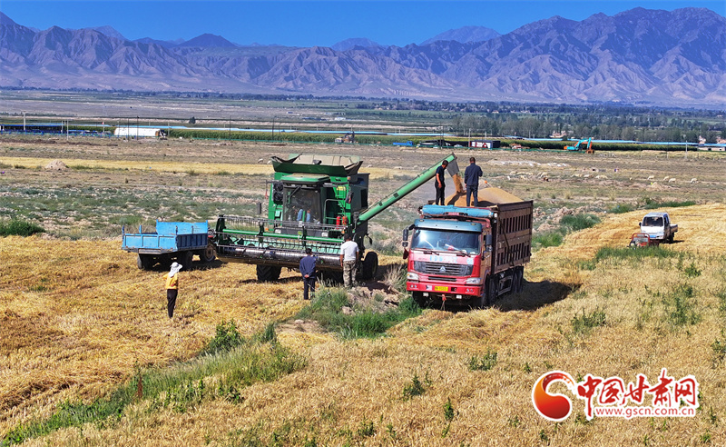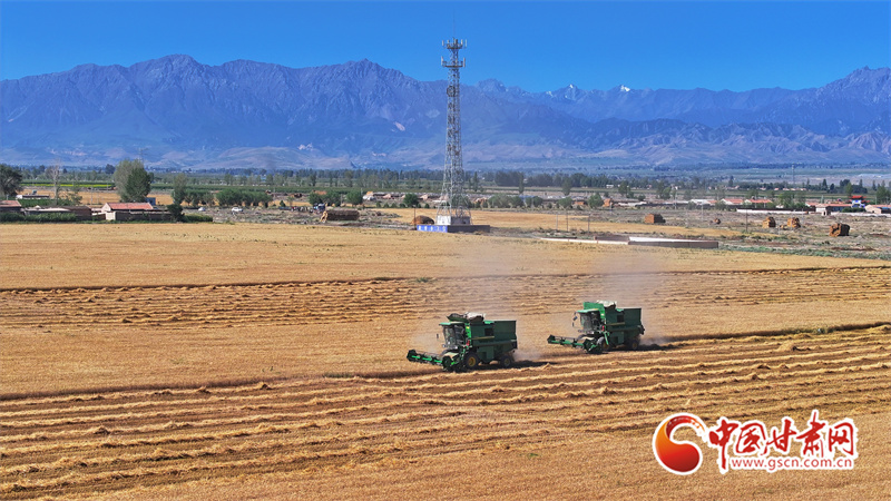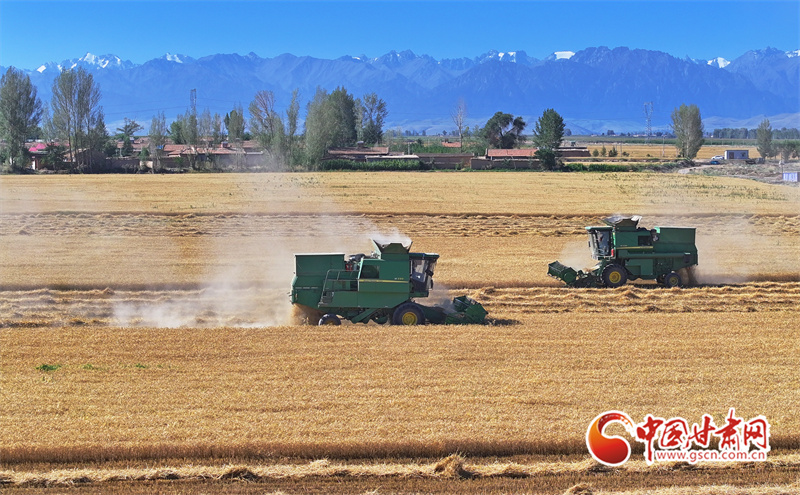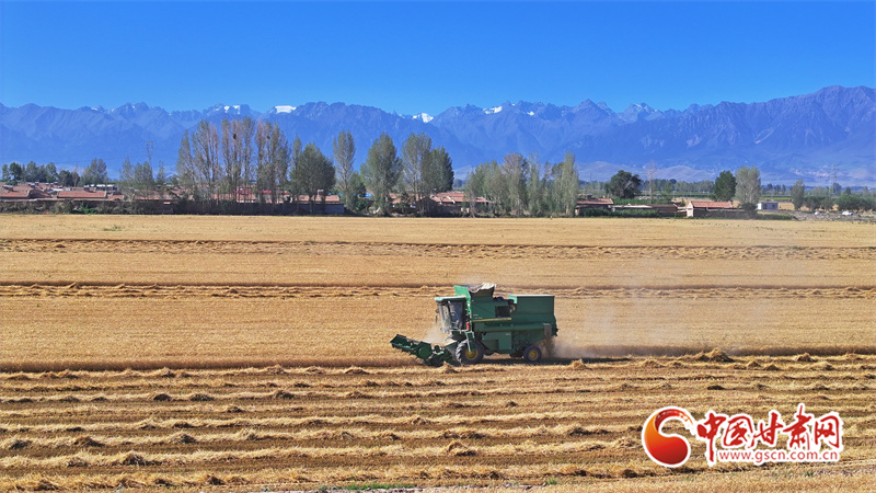 眼下,位于祁連山下的民樂(lè)縣南古鎮(zhèn)毛城村800畝連片小麥種植基地上,機(jī)聲隆隆,農(nóng)機(jī)手們駕駛收割機(jī)穿梭往返麥田之中搶收小麥,一派忙碌的豐收景象。近期,隨著民樂(lè)縣沿祁連山冷涼山區(qū)小麥迎來(lái)成熟季,民樂(lè)縣種植的26萬(wàn)畝小麥進(jìn)入了繁忙的收割期。