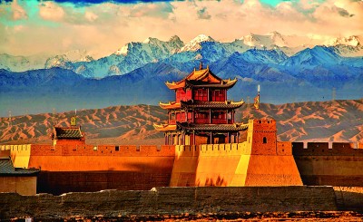 雄關(guān)六百載,長城越千年。看今朝,戈壁之上,嘉峪關(guān)關(guān)城的朱色城樓與終年皚皚的祁連雪峰交相輝映,歷經(jīng)風(fēng)霜久而彌堅;峭壁之巔,長城第一墩矗立于此,腳下流淌的討賴河水澎湃不息;山脊之上,懸壁長城形似凌空倒掛,氣勢雄偉。
