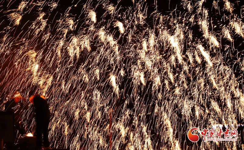 10月5日晚,位于甘肅省張掖市甘州區(qū)的玉水苑生態(tài)景區(qū)內(nèi),非遺傳承人在為游客和市民表演國家級非遺項(xiàng)目打鐵花。(王將 攝)