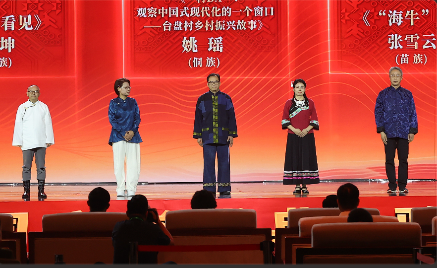 吉米平階、牛海坤、姚瑤、張雪云、周建新領(lǐng)取第十三屆全國少數(shù)民族文學(xué)創(chuàng)作駿馬獎報(bào)告文學(xué)獎。
