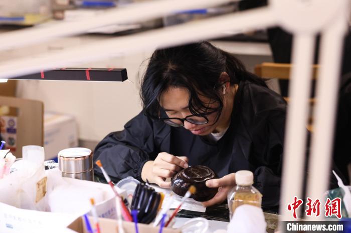 11月27日,南昌漢代海昏侯國(guó)遺址博物館的漆器修復(fù)室內(nèi),文物修復(fù)師正在修復(fù)一件漆器?!⑺紓?nbsp;攝