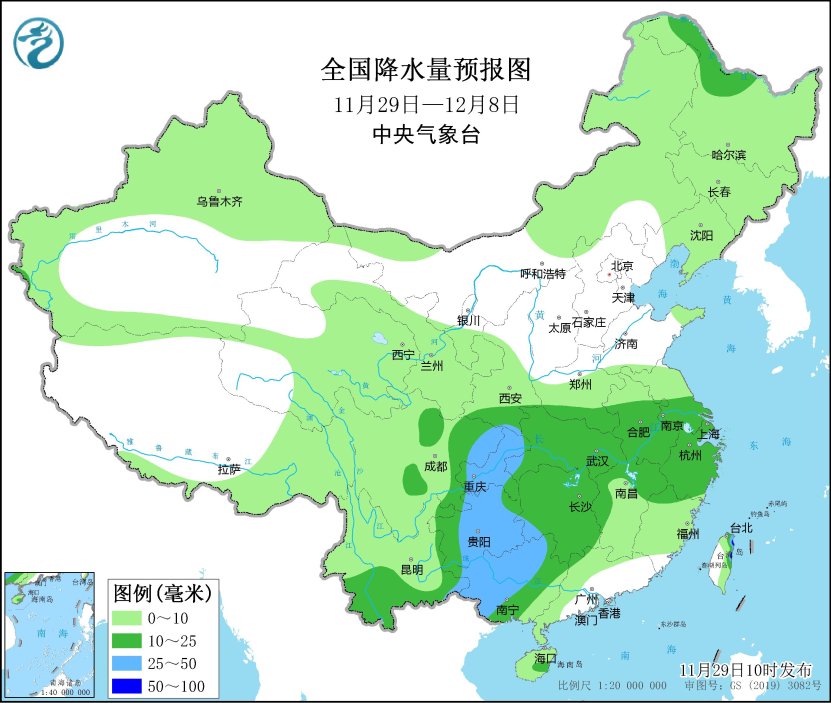 未來10天(11月29日-12月8日),東北地區(qū)中北部、內(nèi)蒙古東北部等地部分地區(qū)累計(jì)降水量有8~15毫米;西南地區(qū)東部和南部、江漢、江淮、江南西部和北部、廣西西部及臺灣島等地部分地區(qū)有10~20毫米,局地30~60毫米;云貴高原、內(nèi)蒙古東北部、東北地區(qū)等地部分地區(qū)累計(jì)降水量較常年同期偏多1~3倍,我國其余大部地區(qū)降水偏少。