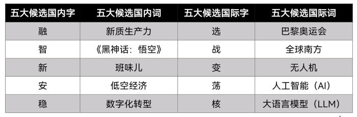 國內(nèi)字詞前五位分別是“融、智、新、安、穩(wěn)”和“新質(zhì)生產(chǎn)力、《黑神話:悟空》、班味兒、低空經(jīng)濟、數(shù)字化轉(zhuǎn)型”;國際字詞前五位分別是“選、戰(zhàn)、變、蕩、核”和“巴黎奧運會、全球南方、無人機、人工智能(AI)、大語言模型(LLM)”。