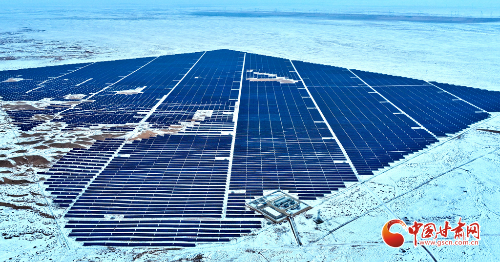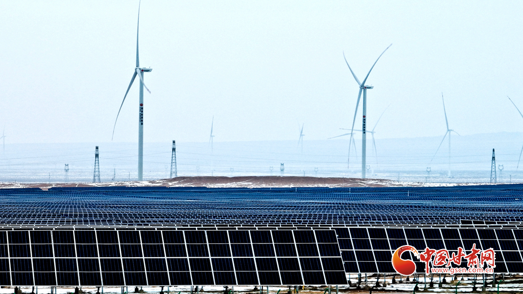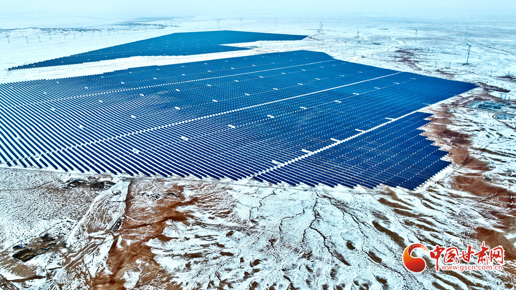 12月18日, 一場(chǎng)大雪過后,大漠深處的張掖市臨澤縣北部灘新能源產(chǎn)業(yè)園內(nèi),81.1萬千瓦光伏治沙光伏集陣和85萬千瓦風(fēng)力發(fā)電機(jī)組群,在防沙治沙的同時(shí)將光熱和風(fēng)力轉(zhuǎn)換為電能輸入國(guó)家電網(wǎng),推進(jìn)了“西電東送”輸電工程建設(shè)。