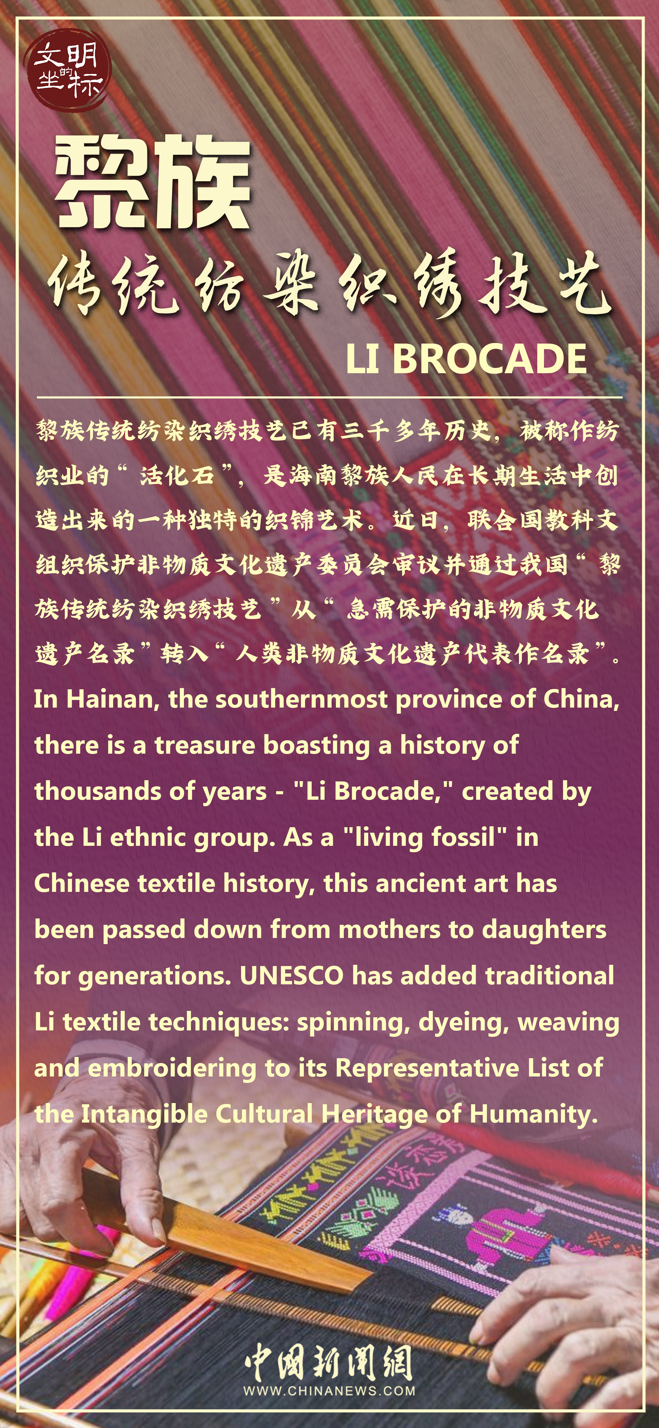 日前,黎族傳統(tǒng)紡染織繡技藝從聯(lián)合國教科文組織“急需保護的非物質(zhì)文化遺產(chǎn)名錄”轉(zhuǎn)入“人類非物質(zhì)文化遺產(chǎn)代表作名錄”,引發(fā)關注。黎族傳統(tǒng)紡染織繡技藝已有三千多年歷史,被稱作紡織業(yè)的“活化石”。對于沒有創(chuàng)造文字的黎族,黎錦像是一本“史書”,寫就了這個民族的文化和智慧。早在新石器時代,海南島上的黎族先民已會使用工具制作繩索或絲線。西漢時期,已織造出精美的“廣幅布”。至宋代,黎族的紡織達到很高水平。元代,黎族紡織工藝已傳至全國。黎族傳統(tǒng)紡染織繡技藝有麻織、棉織、織錦、印染(包括扎染)、刺繡、龍被等品種,以色彩鮮艷、圖案多樣、工藝精湛而聞名。如今,古老黎錦正穿越歷史長河,以時尚化、潮流化、年輕化的設計形態(tài)融入現(xiàn)代日常生活。