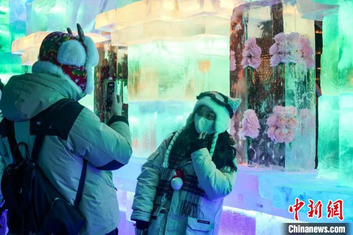 游客在哈爾濱冰燈藝術(shù)游園會(huì)打卡拍照 趙宇航 攝