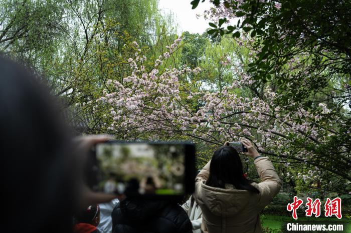 圖為3月16日,市民準(zhǔn)備在棠湖公園內(nèi)的海棠樹下自拍。韓金雨 攝