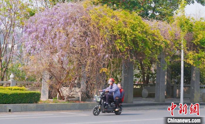 近日,廣西賀州市北堤公園的紫藤花迎春盛放,一串串紫藤花垂掛枝頭,花朵飽滿(mǎn)可愛(ài),在綠色枝葉的掩映下,呈現(xiàn)出一派朝氣蓬勃的景象。圖為市民從紫藤花下路過(guò)。覃麗華  攝