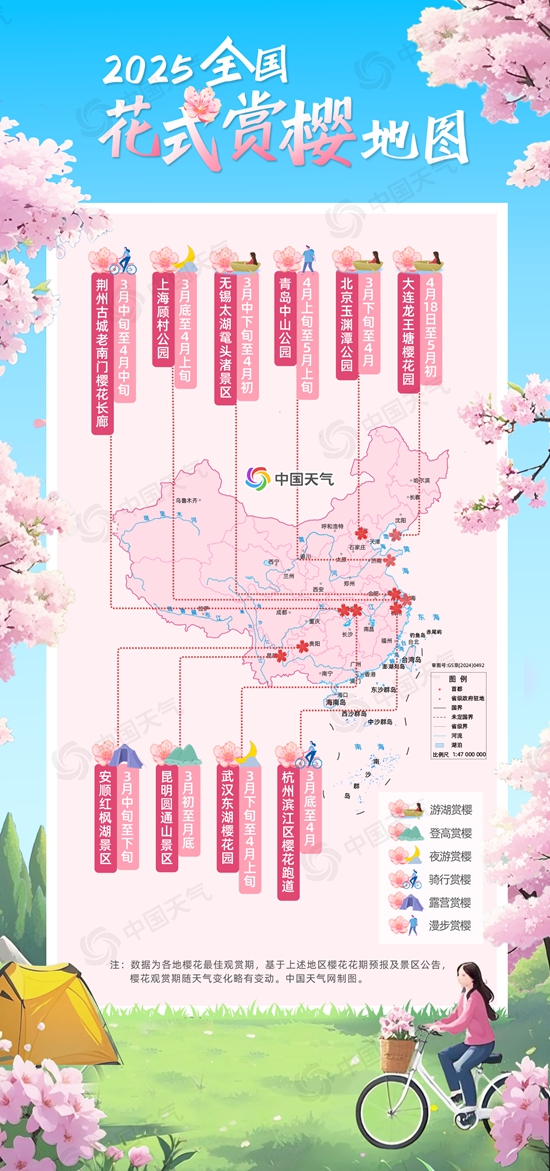 “櫻花紅陌上,柳葉綠池邊。”又是一年櫻花季!今年3月中下旬以來,我國大部經歷了大回暖,催動春花盛放,目前武漢、南京等地櫻花已進入盛花期,北方多地櫻花也開始迎來觀賞期。中國天氣網特別推出2025全國花式賞櫻地圖,盤點十大賞櫻勝地最佳觀賞期和花式玩法,快來開啟你的賞櫻之旅吧。