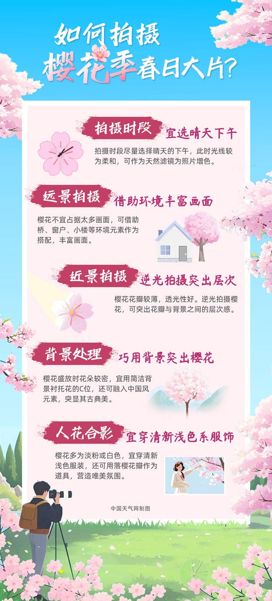 櫻花盛放燦若云霞,但花季卻十分短暫,拍照是留住櫻花之美的絕佳方法之一。如何捕捉櫻花的層次感?人花合影如何營造浪漫氛圍感?中國天氣網從景別、構圖、拍攝時段等方面總結了拍攝小貼士,助你拍出絕美春日大片。