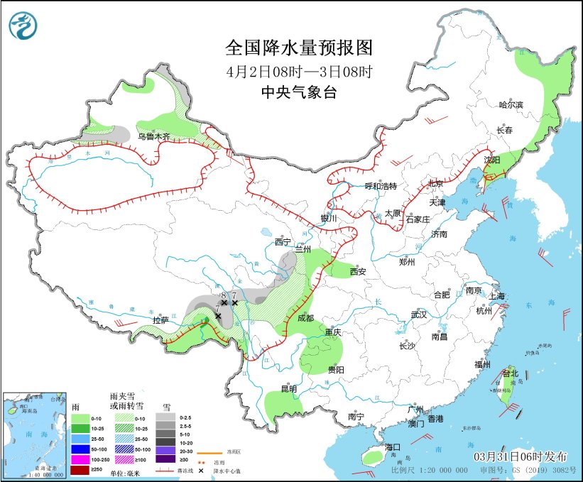 4月1日08時至2日08時,內(nèi)蒙古東部、黑龍江中東部、吉林東部、遼寧東北部、新疆西北部山區(qū)、西藏東部、青海南部、川西高原北部等地部分地區(qū)有小到中雪或雨夾雪,其中,新疆沿天山地區(qū)、西藏東部、川西高原北部等地部分地區(qū)有大雪,局地暴雪(10~16毫米)。新疆伊犁河谷和北疆盆地、西藏東南部、吉林中部、遼寧大部、山東半島、西南地區(qū)東部和南部、海南島東部、臺灣島等地部分地區(qū)有小到中雨,其中,西藏東南部等地局部地區(qū)有大雨(25~40毫米)。西藏南部、內(nèi)蒙古中部、遼寧中南部、河北中南部、天津、山西、山東半島、浙江東部等地部分地區(qū)有4~6級風,西藏東部部分地區(qū)有6~7級風;渤海、渤海海峽、黃海西部、東海南部、臺灣海峽、臺灣以東洋面、巴士海峽、南海中北部海域有6~7級風,陣風8級。