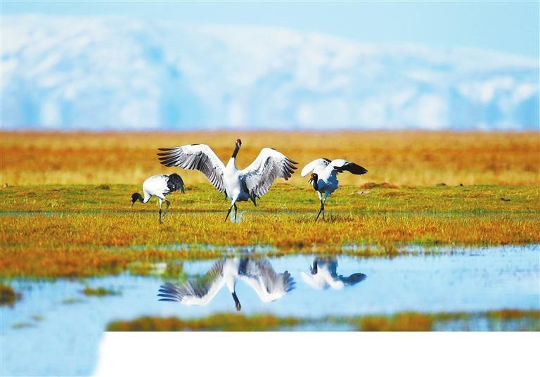 尕海濕地的黑頸鶴。
