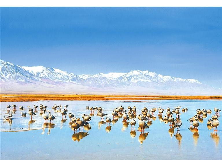 當(dāng)祁連山的雪線以肉眼難以察覺的速度后退時,鹽池灣的冰封鏡面開始出現(xiàn)裂紋。最先感知到這一變化的不是融水沖刷出的溝壑,而是斑頭雁黃色的喙。它們在三月底的晨昏線上劃過,雙翅呼呼生風(fēng)。冰凌碎屑尚未與雁羽摩擦,便已發(fā)出細密的簌響,像是古琴開弦前的調(diào)音。野馬南山與黨河南山兩山之間形成的盆地內(nèi)河流縱橫、湖泊密布,草甸、沼澤交錯,是斑頭雁和其他水鳥世代棲息繁衍的場所。盡管先頭部隊在3月下旬就已抵達這里,主力部隊卻要到4月上旬才會姍姍來遲。此時斑頭雁幼體已在越冬地充分發(fā)育,羽衣上幾乎看不到如苔蘚般斑駁生長的新羽,只是頭部的兩條黑帶不如父母深邃,這是它們少經(jīng)風(fēng)霜的證明。它們降落在濕地灘涂時,雝雝鳴雁,那聲音或許與兩千年前蘇武牧羊時在北海之畔聽到的有些許相似。