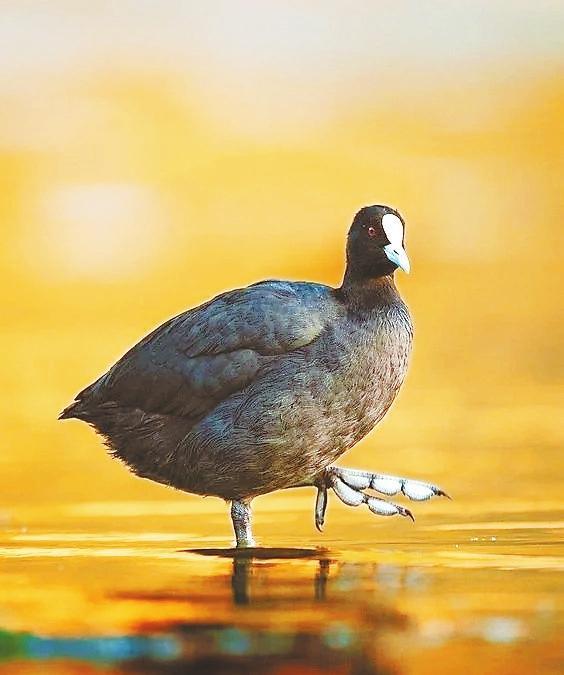 白骨頂又被喚作骨頂雞,卻是鶴類的遠親。它靜浮水面時,額前一抹象牙白,宛若遺落人間的墨玉鎮(zhèn)紙。這枚額甲實為特化的角質(zhì)層,是為了保護頭部的盔胄?;野咨陌牾肴缪┑匮グ惆洪g,劃開水藻時泛起粼粼波光——這身黑羽配雪蹼的穿搭,竟比時裝周的極簡主義更先鋒。當(dāng)它們列隊掠過蘆葦蕩,水淼勾勒的剪影里,仿佛在繪制著秋天的信箋。