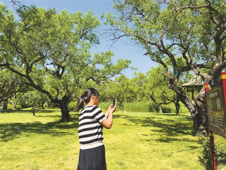 行至平沙落雁,路旁綠草之上,一株百年文冠果樹上果實累累,宛如哨兵般靜靜守候,為熱鬧的街市增添了幾分寧靜。在綠色公園內(nèi),一株700年樹齡的古國槐枝繁葉茂。復古的支架穩(wěn)穩(wěn)支撐著枝干,既確保它在歲月中安然生長,又透出滄桑之感?;◢弾r圍欄環(huán)繞四周,其上雕刻的荷葉荷花圖案栩栩如生,“愛護樹木”“保護生態(tài)”等文字清晰可見,無聲地倡導著人們保護環(huán)境、愛護植物。退休教師王淑芬正帶著小孫女玩耍,她笑著說:“這兒空氣好,景色美,每天帶孩子來親近古樹,也是在給她種下愛護自然的種子。”游客的歡笑聲、孩童的嬉戲聲與清脆的鳥鳴聲交織在一起,為古樹增添了別樣的活力。