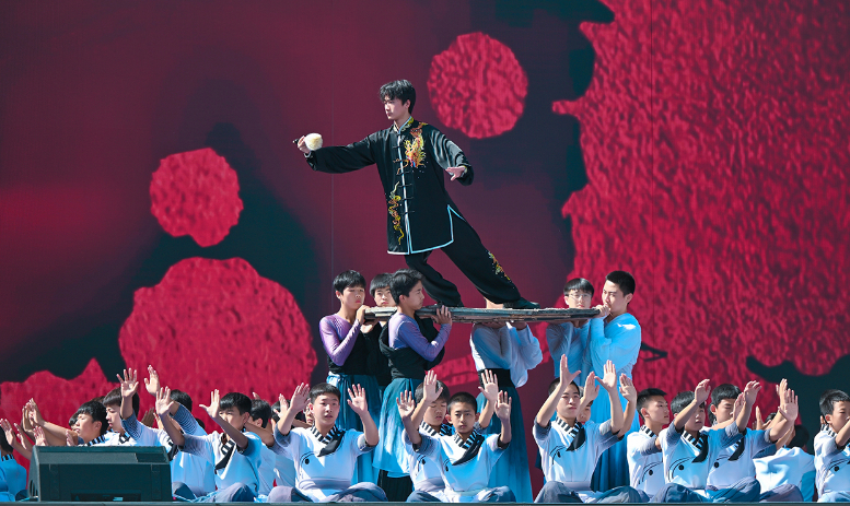 活動伊始,開場片《歡迎乘坐崆峒號》以“環(huán)西部火車游·崆峒號”平涼旅游專列為靈感,通過跨時空對話串聯崆峒山古今脈絡,拉開活動序幕。現場,街舞與崆峒武術團體合作的《武韻崆峒》展現武術與現代肢體藝術新生機;笛子演奏與武術冠軍聯袂呈現的《崆音劍影》打造“可聽的武術”沉浸式體驗;30人陣容的江蘇武協女子太極拳團體演繹《鶴起崆峒》,詮釋武術新功用;國風歌手與秦腔表演藝術家合作的《秦韻長歌》,展現“武戲同源”的多元魅力。