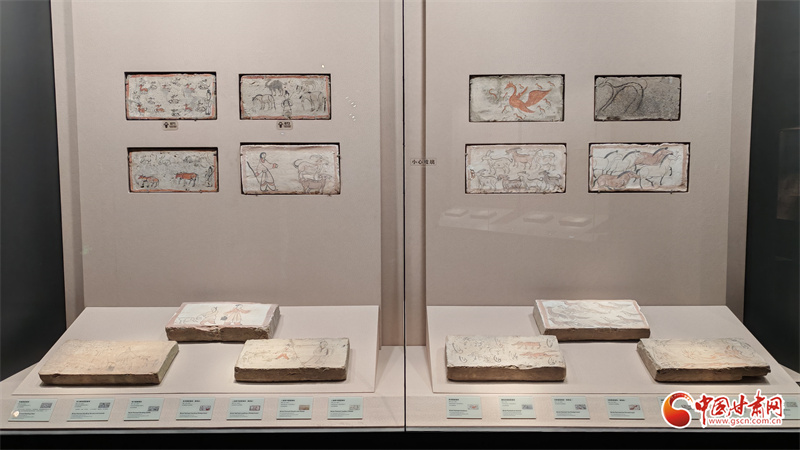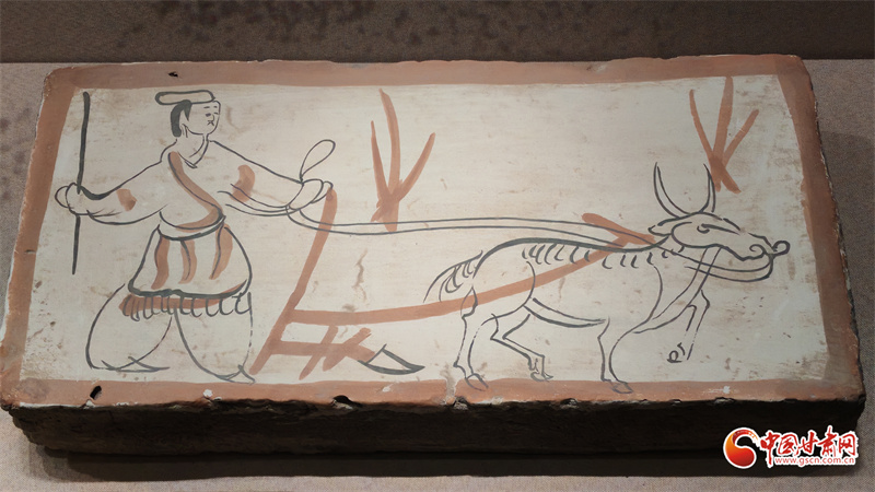 在博物館的“古冢丹青——高臺(tái)魏晉十六國(guó)時(shí)期墓葬壁畫藝術(shù)陳列”展廳里,記者看到,《二牛耕地畫像磚》生動(dòng)再現(xiàn)了當(dāng)時(shí)的農(nóng)耕技術(shù):兩頭耕牛架著直轅犁,后隨的男子一手扶犁一手揚(yáng)鞭,展現(xiàn)了典型的“二牛抬杠”耕作方式?!赌谅箞D壁畫磚》則描繪了古人放牧鹿群的獨(dú)特場(chǎng)景,為研究當(dāng)時(shí)的畜牧業(yè)發(fā)展提供了珍貴資料。