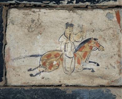 它的“不一般”,首先在于其“極簡卻傳神”的藝術(shù)風(fēng)格。該磚的畫面以赭石色為底,墨線寥寥,卻生動勾勒出一位策馬疾馳的驛使:頭戴魏晉幘帽,身著右衽短衫,左手控韁,右手舉著文書。而駿馬則四蹄騰空,動態(tài)感十足,一種風(fēng)馳電掣的緊迫感似從畫中撲面而來。更耐人尋味的是,畫師刻意省略了驛使的嘴巴:這一“殘缺”設(shè)計,并非疏忽,而是古人智慧的體現(xiàn),象征著郵驛制度中“守口如瓶”的保密原則,使其成為中國古代信息保密文化的生動見證。