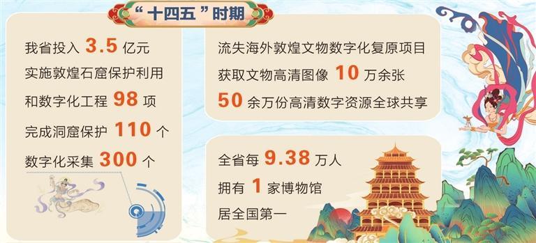 在文物保護(hù)提質(zhì)升級方面,我省投入3.5億元,實施敦煌石窟保護(hù)利用和數(shù)字化工程98項,完成洞窟保護(hù)110個、數(shù)字化采集300個,建成全球首個文物保護(hù)多場耦合實驗室,制定國家和行業(yè)標(biāo)準(zhǔn)27項,科研成果服務(wù)16省市及部分共建“一帶一路”國家;流失海外敦煌文物數(shù)字化復(fù)原項目獲取文物高清圖像10萬余張,50余萬份高清數(shù)字資源全球共享;第四次全國文物普查新發(fā)現(xiàn)線索4659條,投入24.26億元實施900余項重要文保項目;打造河西走廊國家遺產(chǎn)線路,創(chuàng)建嘉峪關(guān)長城國家文物保護(hù)利用示范區(qū),全省文物系統(tǒng)性保護(hù)成效顯著,“中國特色?敦煌經(jīng)驗”國際影響力持續(xù)提升。