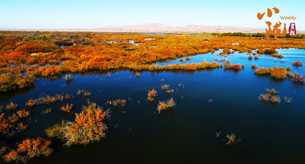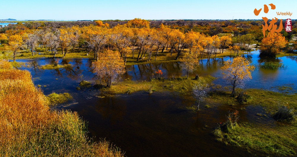金色胡楊在陽(yáng)光下泛著溫暖光澤,斑斕絢麗的蘆葦如金色絲帶點(diǎn)綴荒漠,與碧綠河水、湛藍(lán)天空構(gòu)成濃墨重彩的秋日?qǐng)D景。