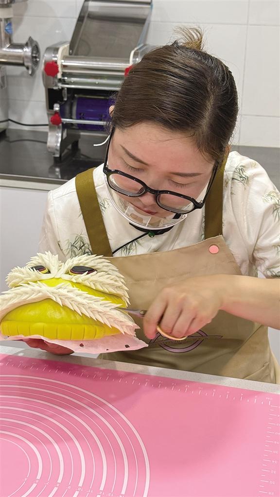 走進楊曉蘭的花饃小店,濃郁面香裹挾著藝術(shù)氣息撲面而來。展架上,威風(fēng)凜凜的醒獅昂首欲嘯,憨態(tài)可掬的卡通角色惹人喜愛,盤踞的靈蛇栩栩如生……此刻,她正凝神制作醒獅花饃,搓、捏、塑形,面團在她指尖迅速呈現(xiàn)出獅頭的威武雛形。